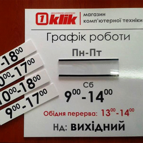 Одним із видів інтер’єрної реклами є вказівники, інформаційні дошки та таблички на дверях. Чітке маркування приміщення допоможе вашим клієнтам знайти потрібне місце.